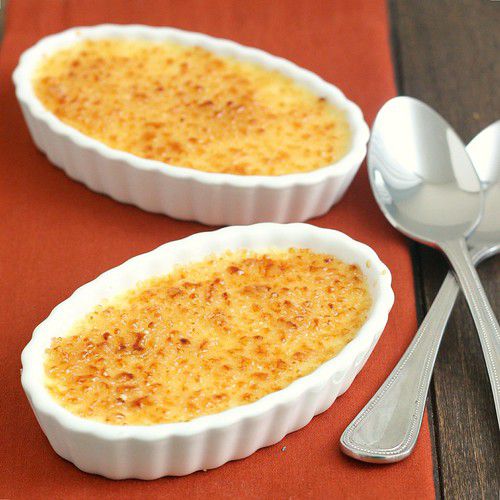 Transfer the roasting pan to your oven rack, and then pour the boiling water into the pan (carefully, you don’t want to get any water in the ramekin). The boiling water should come about 2/3 of the way up the sides of the small ramekins/fluted dishes you’re using. Bake until an instant-read thermometer inserted in the center registers 170-175 F – the custards will be just barely set. Baking time will vary depending on the size dish you used and range from about 25-40 minutes (my dishes were only 3 oz and baked in about 24 minutes). Begin checking the temperature about 20-25 minutes in and you’ll get a good sense of how much longer they have.