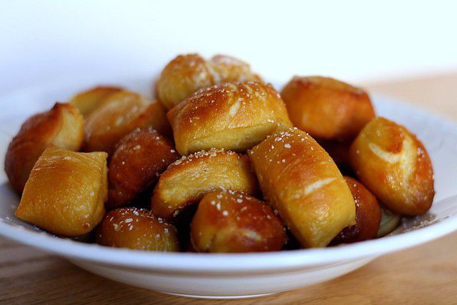Remove the dough from the bowl and place on a flat surface. Divide the dough into 8 equal pieces, about 4 1/4 to 4 1/2 ounces each. Roll each piece into a long rope measuring about 22 inches. Cut the dough into one inch pieces to make pretzel bites. Boil the pretzel bites in the water solution in batches of about 10-15 for 30 seconds. Remove with a large slotted spoon and place the pretzel bites on the prepared baking sheets, making sure they aren’t touching. Brush the tops with the egg wash and season liberally with the salt. Place into the oven and bake for 15 to 18 minutes, or until golden brown.